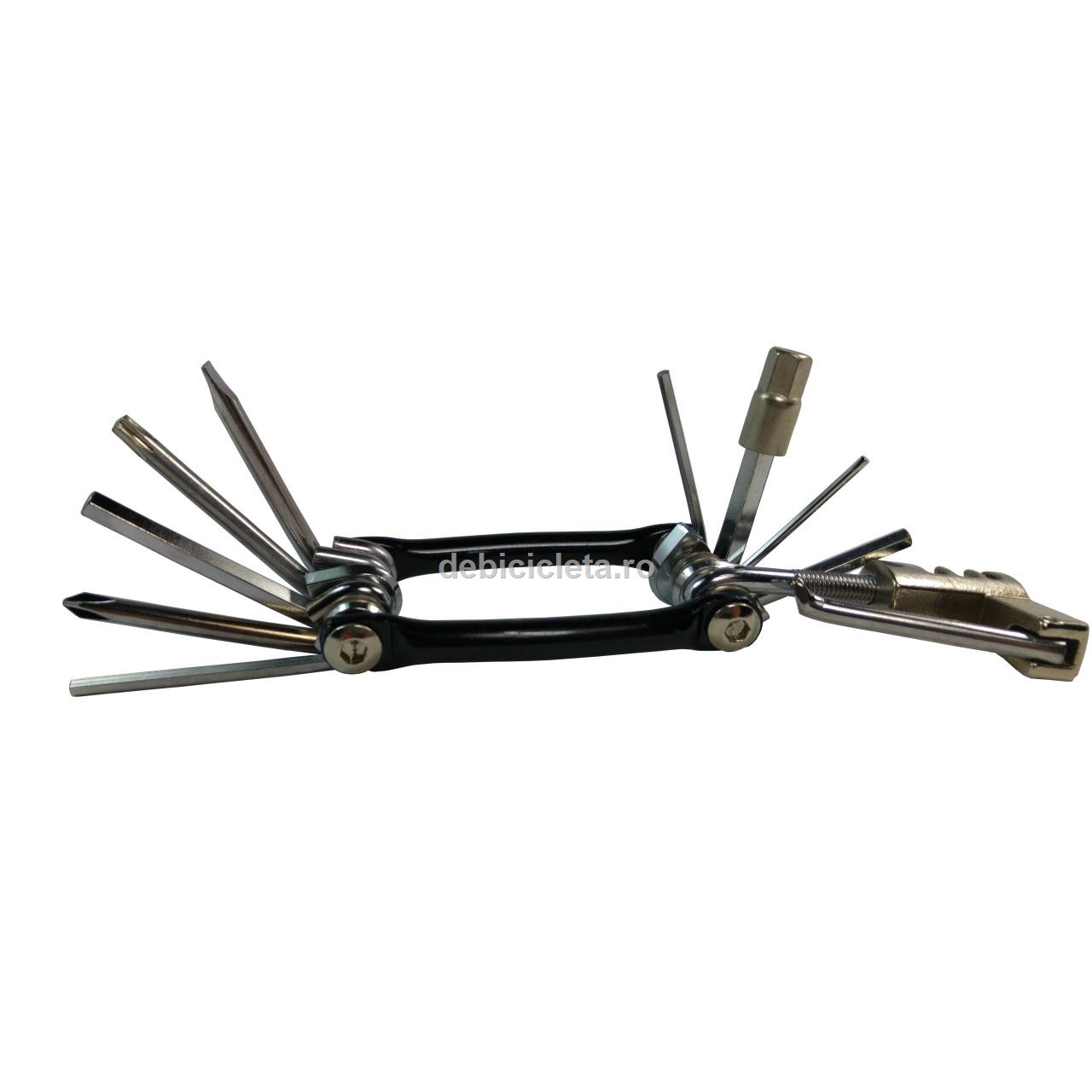14 unelte întruna singură, această unealtă eficientă vă ajută în reglajele efectuate înafara atelierului specializat. Indispensabil la deplasări lungi, uşor de purtat într-un buzunar al bluzei de ciclism, vă poate scoate uşor din orice situaţie neplăcută generată la bicicletă şi nu numai. Culoare: negru.