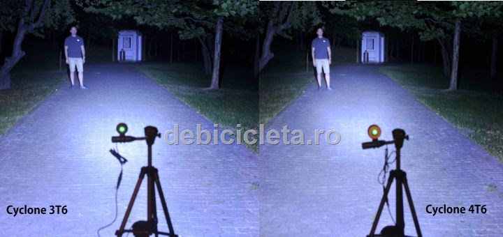 Dupa prelucrarea specifica/identica, concluziile sunt usor vizibile: farul Cyclone 3T6 acopera mai bine zonele periferice, iluminand mai larg centrul imaginii, pe cand farul Cyclone 4T6 concentreaza mai intens in directia in care este indreptat, avand in acelasi timp o putere mai mare. Amprenta la sol a fasciculului luminos este mai larg la Cyclone 3T6 si mai intens la Cyclone 4T6: pantalonii subiectului dar si casuta din plan departat sunt mai intens luminate de farul cu 4 LED-uri.