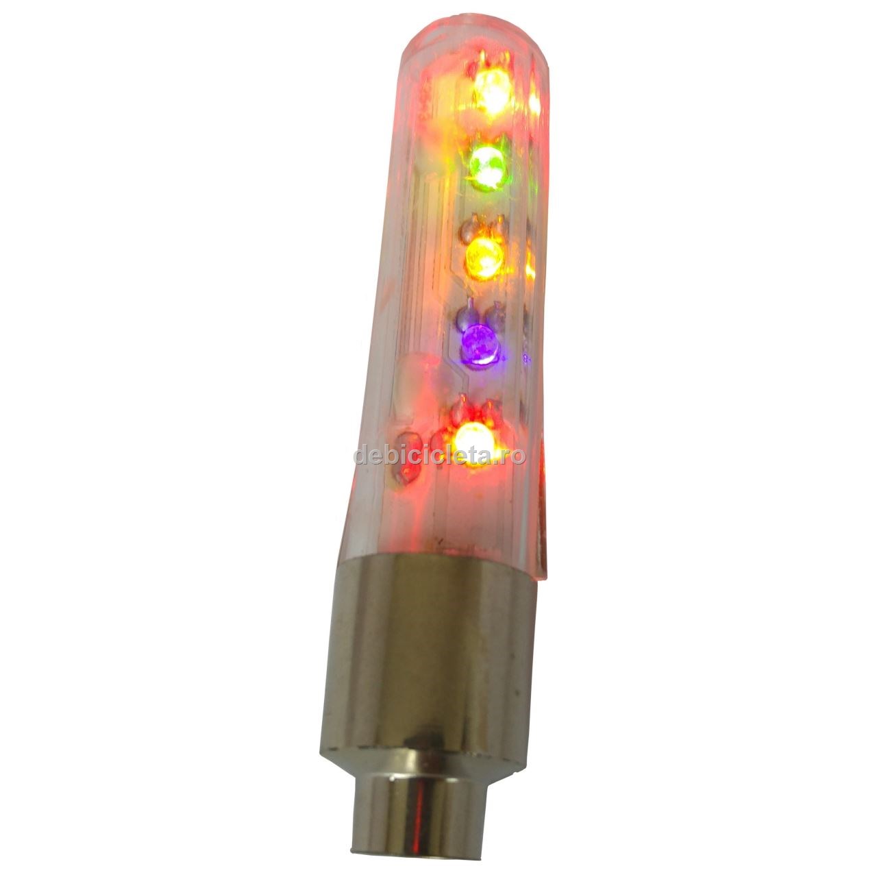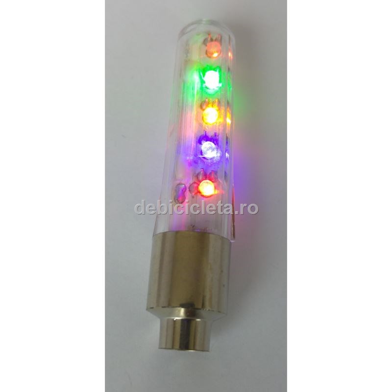 Capacul pentru ventil de roată colorează deplasarea dumneavoastră pe timp de noapte, fie că e cu bicicleta, fie cu motorul, fie cu masina. Capacul ce foloseşte 3 baterii AG10 incluse în pachet, este activat la mişcare, luminând doar când roata se învârte. Uşor de instalat, se înşurubeaza pe ventilul uzual al roţii direct sau cu adaptorul pentru ventilul de bicicleta. Capacul foloseste 5 LED-uri (roşu, mov, galben, verde, portocaliu) şi le aprinde intermitent, formele colorate desenate de roţi variind vesel. Produs util pentru crescut interesul celor mici faţă de sportul cu pedale.