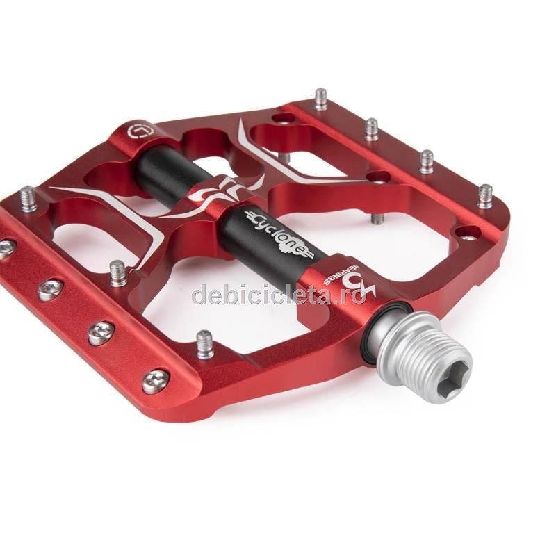 Pedale excelente cu 3 rulmenti capsulati si design stilat. Axul pedalei este din aliaj Crom-Molibden. Potrivite la biciclete BMX, MTB sau de oras. Filet 9/16inch. Setul de 14 pini anti-alunecare distribuiti pe ambele fete ale pedalei fixeaza ferm talpa biciclistului, asigurand transmiterea fortei motrice la axul pedalier, fara risc de alunecare chiar si pe talpa uda. Combinatia intre aderenta foarte buna, indiferent de inclinarea piciorului si stilul tehnologizat al pedalelor Cyclone atrag privirile si sustin performanta ciclistului. Designul acestor pedale durabile si late le scade greutatea. Waterproof, dustproof. Compatibile cu majoritatea bicicletelor de pe piata cu pozitia (stanga/dreapta) marcata vizibil. Culoare: rosu.
