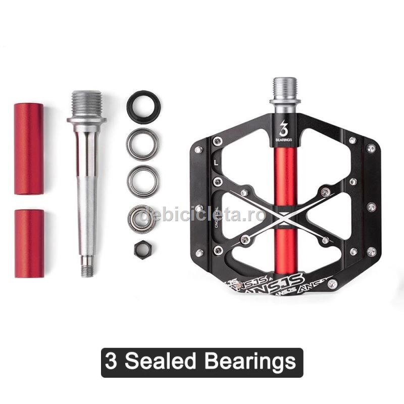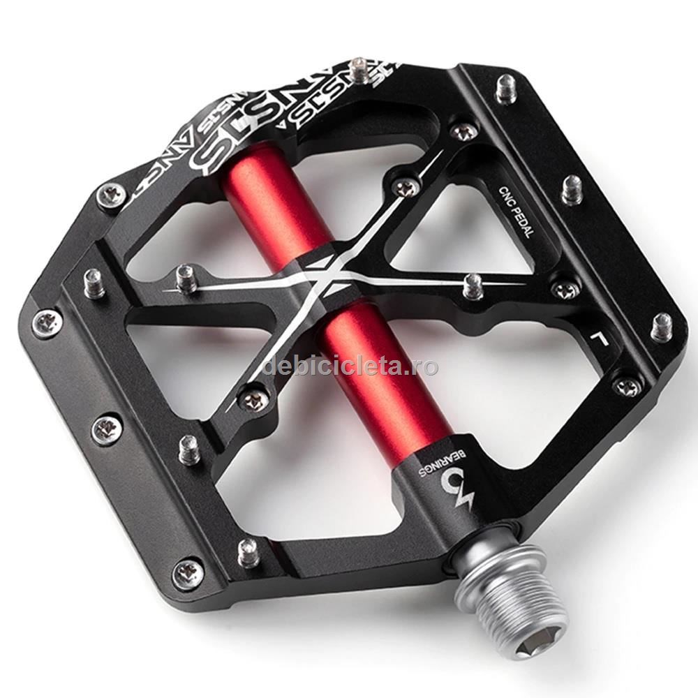 Pedale excelente cu 3 rulmenţi capsulaţi şi design stilat. Axul pedalei este din aliaj oţel Crom-Molibden. Potrivite la biciclete BMX şi MTB. Filet 9/16". Numarul mare de 18 pini anti-alunecare distribuiţi pe ambele feţe ale pedalei fixează ferm talpa biciclistului, asigurand transmiterea forţei motrice la axul pedalier, fără risc de alunecare chiar şi pe talpă udă. Combinaţia între aderenţa foarte bună, indiferent de înclinarea piciorului şi stilul tehnologizat al pedalelor Cyclone SJS atrag privirile şi susţin performanţa ciclistului. Designul acestor pedale durabile şi late le scade greutatea. Compatibile cu majoritatea bicicletelor de pe piaţă. Culoare: negru.